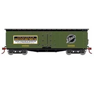 In the 1920’s, the Pfaudler Company and General American Car Company manufactured hundreds of wood sheathed, insulated milk cars. Designed as bulk milk carriers, the cars were built around two 6,000-gallon glass lined tanks and a brine cooling system designed to keep the milk at a constant 38 degrees Fahrenheit. Riding on passenger car trucks, these unique cars were often painted Pullman green to match the passenger cars of the era. The special purpose Pfaudler Cars hauled bulk milk shipments well into the 1950’s.