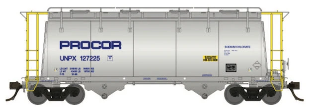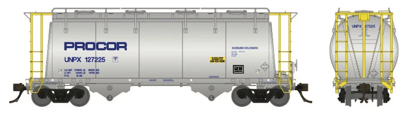 Over the years Procor would assemble a fleet of more than 1,300 aluminum sodium chlorate service covered hopper cars, a portion of which was constructed by NSC and Thrall. The Rapido version is representative of later production cars fitted with steel gull wing end structures.